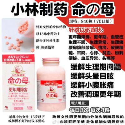 小林命母,840粒 ,送给妈妈最好的💗 日本小林制药针对更年期妇女开发的命母丸,不仅仅针对更年期,对于任何月经不调、情绪紊乱的女性,以及因为激素不调引起头痛、肌肤暗淡、发冷等多种症状的女性,都有很好的帮助!不要说自己妈妈还没有更年期症状,真有症状就晚了~是补品不是药~!