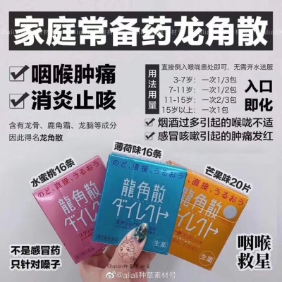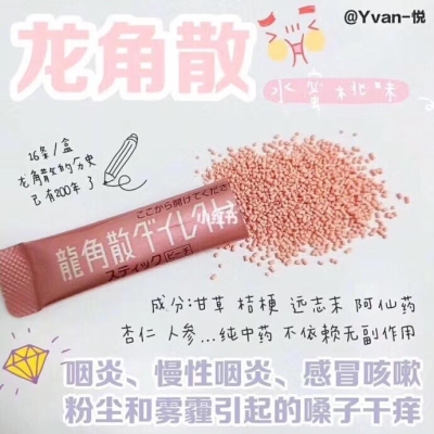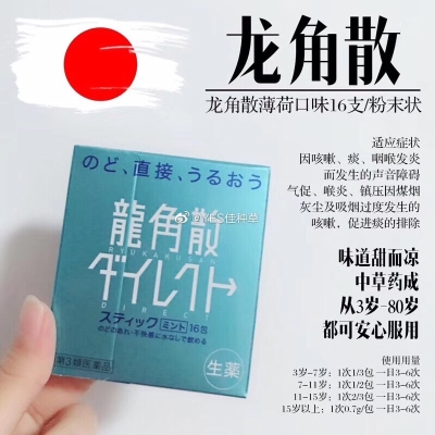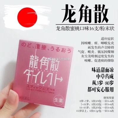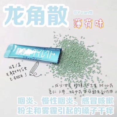 🇯🇵日本神药龙角散,现货蓝色🍃薄荷味,粉色🍑蜜桃龙角散在日本可谓家喻户晓,有200多年的历史,对嗓子不适,吸烟过多,感冒引起的喉咙肿痛,咳嗽不止均有明显的缓和作用。薄荷味、蜜桃味为粉末状。可直接对着患处倒入,入口即化,见效快。最主要味道甜甜的,凉凉的。全部中草药成分,从3岁小朋友到80岁的老人都可以安心服用哦。