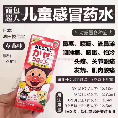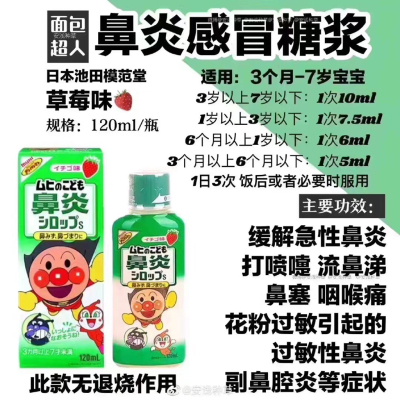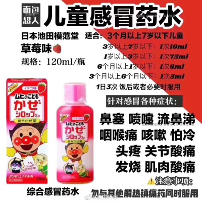 ‼红,粉,蓝!绿💯好用的面包超人的宝宝感冒药水,效果超赞!!3个🈷至10岁前都可以用!!~综合感冒药水(可退烧)粉色蜜桃味,红色草莓味!!!蓝瓶咳嗽药水,绿色流鼻涕✅这个口味很赞[偷笑]对于不爱吃药的宝宝简直太赞!!3个月以上都可服用。鼻塞、鼻涕、咳嗽、发烧都可以搞定。如果不发烧,吃蓝色的咳嗽药水就好…有宝宝的家庭必备✅