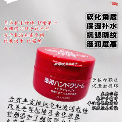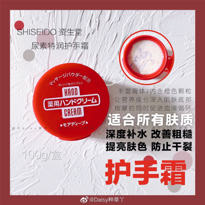 100g资生堂尿素护手霜💖日本护手神话+销量第1🏆的资生堂手霜 👸🏻含有丰富维他命成份及滋润成份、改善手部粗糙及老化现象✨特别添加了超级弹力成分 .🈚香料🈚色素 🈶按摩滋养颗粒 滋润却不腻 清爽的质地 更容易吸收 经常洗手会让手更干燥,这款护手霜更是必不可少的呦[愉快]