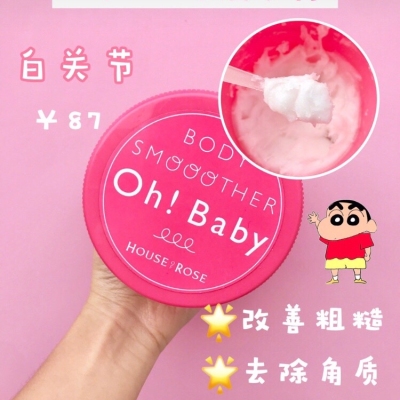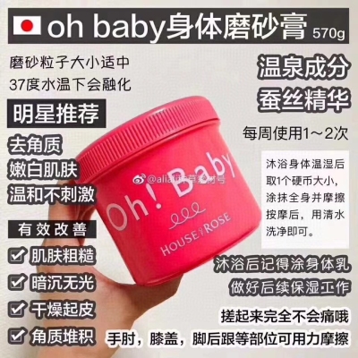 这玩意那是相当重啊[流泪]日本house of rose Ohbaby蚕丝精华身体去角质磨砂膏。570克 (一大罐哦 ) 连续3年cosme美体第一名☝️固体膏状,添加蚕丝微粒,给身体去角质的同时,不会伤害肌肤,让皮肤柔软水嫩滑溜溜~温泉水配合保湿效果更佳~一周1-2次,手肘,关节角质比较厚的地方需要多按摩